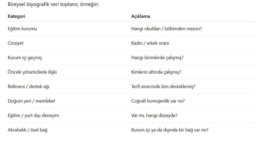 Terfi mekanizması görünürde liyakat temelli olsa da, prosopografik analiz, görünmeyen ilişkisel yapının (akrabalık, okul, hemşehrilik, klikleşme) belirleyici olduğunu ortaya koyar.
