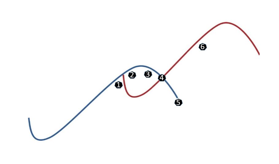 - Bu nokta aynı zamanda ‘Kodak’ noktası olarak adlandırılabilir. Kodak’ın dijital fotoğraf makinesini icat etmesine rağmen bu teknolojinin Pazar üzerindeki yıkıcı etkilerini hesaplayamaması sonun başlangıcı olmuştur. Bu noktada organizasyon ya hayatta kalmak için yeni bir nedene ve fırsata sahip olacak ya da Kodak gerçeğinde olduğu gibi sona doğru inişe geçecektir. Olumsuz örneklerde, genellikle bu noktada yönetimlerin evrensel olduğu düşünce yanılgısına kapıldıkları geçici kavram heveslerine (agile, design thinking, yalın yönetim…vs) kendilerini kaptırdıklarını, bir süre sonra bu yeni heves kavramların ticaret yönünde metalaşmasıyla ciddi kaynak kayıpları yaşandığını gözlemliyoruz.